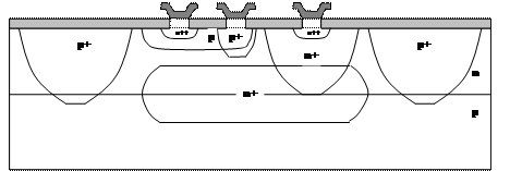 | Рис. 1.3 Структура биполярного транзистора с изоляцией p-n переходом (ИЗОПЛАНАРНАЯ ТЕХНОЛОГИЯ) |