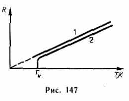 где Т — термодинамическая температура. Качественная температурная зависимость сопротивления металла представлена на рис. 147 (кривая 1). Впоследствии было обнаружено, что сопротивление многих металлов (например, Al, Pb, Zn и др.) и их сплавов при очень низких температурах Тк (0,14 — 20 К), называемых критическими, характерных для каждого вещества, скачкообразно уменьшается до нуля (кривая 2), т.е. металл становится абсолютным проводником.