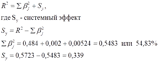 Методом, отвечающим системному подходу является метод разложения коэффициента множественной детерминации на сумму чистых влияний каждого фактора, выраженного β2, и показателя системного эффекта Sy.