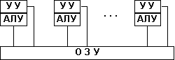 3. При архитектуре с параллельными процессорами несколько АЛУ работают под управлением одного УУ. Это означает, что множество данных может обрабатываться по одной программе – то есть по одному потоку команд. Высокое быстродействие такой архитектуры можно получить только на задачах, в которых одинаковые вычислительные операции выполняются одновременно на различных однотипных наборах данных. Структурная схема таких компьютеров представлена на рис. 2.5.