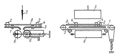 В ножевых фальцмашинах движение листа к фальцаппаратам и между ними происходит, как правило, с помощью тесемочных транспортеров (рис. 24).