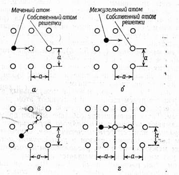 На рис. 3.1, показано движение межузельных атомов, когда в процессе перемещения они вытесняют атом решетки и замещают его; вытесненный атом в свою очередь становится межузельным. Такое перемещение собственных или примесных атомов называют механизмом непрямого перемещения атомов по междоузлиям или эстафетным механизмом. С указанным механизмом непосредственно связан и краудионный механизм, при котором межузельный атом, расположенный посередине между двумя узлами решетки, перемещается к одному из них, смещая при этом атом, расположенный в узле. Вытесненный атом становится межузельным и занимает промежуточное положение решетке (рис. 3.1,г).
