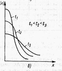 | Рис. 3.2. Распределение примеси при диффузии из неограниченного (а) в ограниченного (б) источников для разных моментов времени |