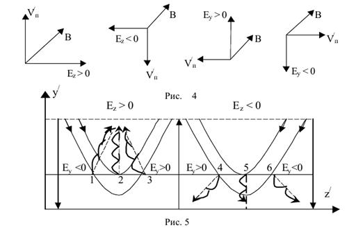(показано на рис. 4) совпадает с направлением векторного произведения [Е х В], то электроны будут перемещаться по циклоидам (рис.5), расположенным вдоль эквипотенциальных линий электрического поля волны (нормали к силовым линиям поля).