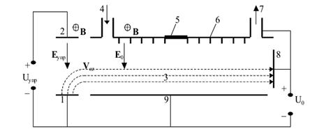 Лампа имеет две основные части: инжектирующее устройство и пространство взаимодействия. Инжектирующее устройство, состоящее из подогреваемого катода 1 и управляющего электрода 2, обеспечивает создание ленточного электронного потока 3 и ввод его в пространство взаимодействия, состоящее из волноводного входа 4, поглотителя 5, замедляющей системы-анода 6, волноводного выхода 7, коллектора 8 и холодного катода 9, обеспечивающих взаимодействие электронов с СВЧ полем. Для создания такого взаимодействия необходимо выполнение условия