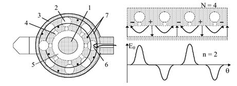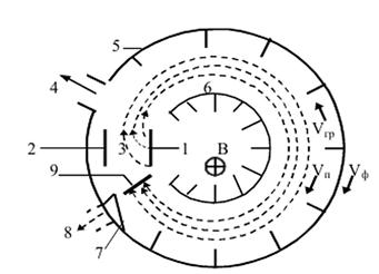 Цилиндрический катод 1 эмитирует электроны со всей поверхности и создает замкнутый электронный поток, который движется с переносной скоростью в кольцевом зазоре 5 между катодом и замедляющей системой - анодом. Замедляющая система магнетрона представляет собой цепочку объёмных резонаторов 2. размещенных в корпусе анодного блока 3 и связанных с кольцевым зазором через щели 4. Этот зазор является пространством взаимодействия электронов с СВЧ полем, энергия которого выводится через