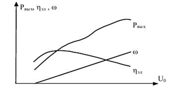 Основные характеристики генераторов на ЛОВМ отображают зависимости выходной мощности, частоты и электронного КПД от напряжения
