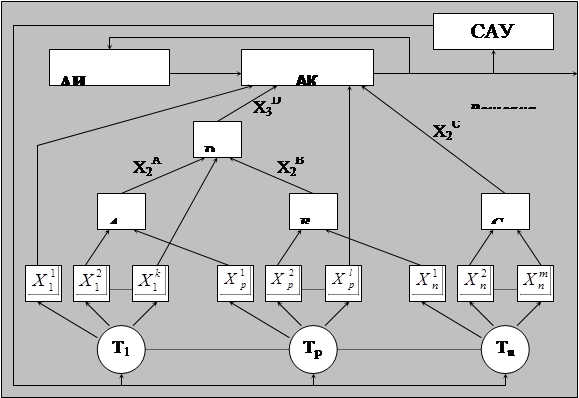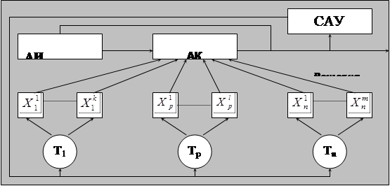 В одноуровневых сложных системах апостериорная информация о признаках распознаваемых объектов x1,...,xn определяется прямыми измерениями непосредственно на основе обработки результатов эксперементов (рис 1.1, где АИ – априорная информация; АК – алгоритм классификации; САУ – система автоматического управления распознаванием; T1,...,Tp,...,Tn – данные технических средств).