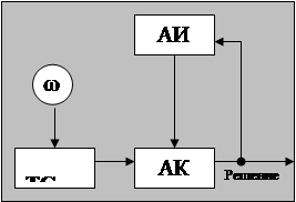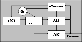 СР с обучением на стадии формирования «работают с учителем». Эта работа заключается в том, что «учитель» многократно предъявляет системе обучающие объекты всех выделенных классов и указывает, к каким классам они принадлежат. Затем «учитель» начинает «экзаменовать» СР, корректируя её ответы до тех пор, пока количество ошибок в среднем не достигнет желаемого уровня. На рисунке 1.3. представлена структурная схема без обучения (где ОО – обучающие объекты; ТС – техниеские средства; АИ – априорная информация; АК – алгоритм классификации, штриховые линии – режим обучения, сплошные линии – «экзамен).