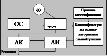 На рисунке 1.4. представлена структурная схема смообучающейся системы (где ОС – объекты для самообучиния; ТС – техниеские средства; АИ – априорная информация; АК – алгоритм классификации, штриховые линии – режим самообучения, сплошные линии – распознавание неизвестных объектов).