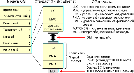 GMII интерфейс. Среданезависимый интерфейс GMII (gigabit media independent interface) обеспечивает взаимодействие между уровнем MAC и физическим уровнем. GMII интерфейс является расширением интерфейса MII и может поддерживать скорости 10, 100 и 1000 Мбит/с. Он имеет отдельные 8 битные приемник и передатчик, и может поддерживать как полудуплексный, так и дуплексный режимы. Кроме этого, GMII интерфейс несет один сигнал, обеспечивающий синхронизацию (clock signal), и два сигнала состояния линии - первый (в состоянии ON) указывает наличие несущей, а второй (в состоянии ON) говорит об отсутствии коллизий - и еще несколько других сигнальных каналов и питание. Трансиверный модуль, охватывающий физический уровень и обеспечивающий один из физических средазависимых интерфейсов, может подключать например к коммутатору Gigabit Ethernet посредством GMII интерфейса.