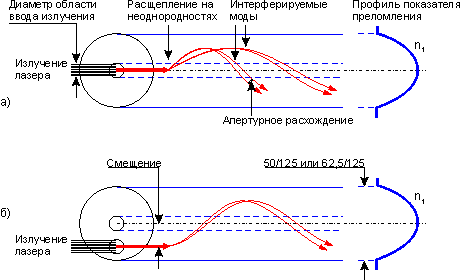 | Рис.3. | Распространение когерентного излучения в многомодовом волокне: а) Проявление эффекта дифференциальной модовой задержки (DMD) при осевом вводе излучения; б) Неосевой ввод когерентного излучения в многомодовое волокно |