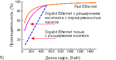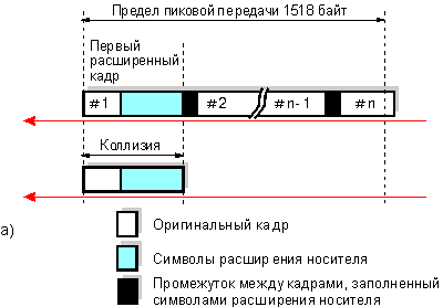 Расширение носителя - это наиболее естественное решение, которое позволило сохранить совместимость со стандартом Fast Ethernet, и такой же диаметр коллизионного домена. Но оно привело к излишней трате полосы пропускания. До 448 байт (512-64) может расходоваться в холостую при передаче короткого кадра. На стадии разработки стандарта Gigabit Ethernet компанией NBase Communications было внесено предложение по модернизации стандарта. Эта модернизация, получившая название пакетная перегруженность, позволяет эффективней использовать поле расширения. Если у станции/коммутатора имеется несколько небольших кадров для отправки, то первый кадр дополняется полем расширения носителя до 512 байт, и отправляется. Остальные кадры отправляются вслед с минимальным межкадровым интервалом в 96 бит, с одним важным исключением - межкадровый интервал заполняется символами расширения, (рис.6а). Таким образом среда не замолкает между посылками коротких оригинальных кадров, и ни какое другое устройство сети не может вклиниться в передачу. Такое пристраивание кадров может происходить до тех пор, пока полное число переданных байт не превысит 1518. Пакетная перегруженность уменьшать вероятность образования коллизий, поскольку перегруженный кадр может испытать коллизию только на этапе передачи первого своего оригинального кадра, включая расширение носителя, что безусловно увеличивает производительность сети, особенно при больших нагрузках (рис.6-б).