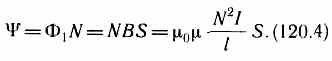 В качестве примера рассчитаем поток вектора В через соленоид. Магнитная индукция однородного поля внутри соленоида с сердечником с магнитной проницаемостью (г, согласно (119.2), равна