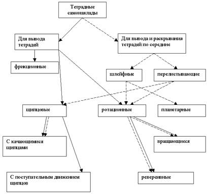 Как видно из схемы, тетрадные самонаклады делятся на две основные группы: самонаклады для вывода тетрадей из магазина и подачи в машину и самонаклады, выполняющие, кроме того, дополнительную операцию – раскрывание тетрадей посередине, необходимость которой определяется технологическим назначением машины, в состав которой они входят.