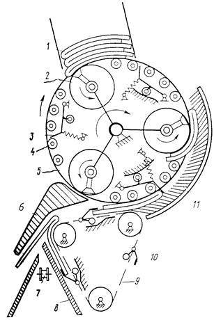 Рис. 34. Принципиальное устройство планетарного наматывающего самонаклада-раскрывателя