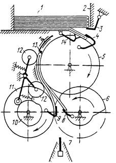 Тетрадь 1 выводится из магазина 2, а рычаг 3 приподнимает стопу для уменьшения давления на выводимую тетрадь 1. Диск 5 и клапаны 4 ведут тетрадь 1 до упора 13, регулируемого в зависимости от формата тетрадей 1. Здесь клапаны 4 отпускают тетрадь 1, а ролики 12 удерживают ее возле упора 13, пока клапан 8 на вращающемся секторе 6 и клапаны 9 на диске 11 не захватят тетрадь 1 за шлейф и вторую часть. Продолжая вращение, они поведут ее вниз на седлообразный стол с поводками цепного транспортера 7. Для уменьшения сил трения ролики 12 при помощи кулака 10 в этот момент отходят от тетради 1.