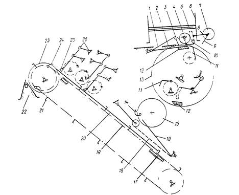 Рис. 36. Кинематическая схема самонаклада перелистывающего типа