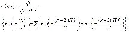 Большая часть приведенных выше основных соотношений (например, формула Пуассона) применимы только к описанию процессов диффузии в неограниченном пространстве. Нередко встречаются и ситуации, когда легируемый объект имеет ограниченные размеры. Например, в одномерном варианте пластина может иметь толщину, сопоставимую с характеристической длиной диффузии. Один из возможных подходов к решению подобных задач состоит в том, чтобы соответствующим образом дополнить этот объект до бесконечного пространства. Такое дополнение должно вестись с соблюдением условий на границах раздела и, конечно, будет содержать бесконечно большое количество дополняющих областей. Естественно, что решение будет представляться бесконечным, однако, во многих случаях быстро сходящимся рядом. Например, диффузия из одномерного точечного источника мощностью Q, расположенного на одной из сторон пластины конечной толщины H с отражающими границами, в результате таких дополнений будет представлять собой бесконечную совокупность источников мощностью 2 Q, расположенными на расстоянии 2 H (рис. 3.9).