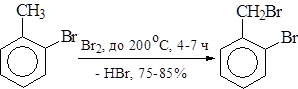 Так, например, бромирование о-бромтолуола, а такжехлорирование п- и о-хлортолуола осуществляют в жидкой фазе при кипении реакционной массы в течение 4-7 часов при освещении кварцевой лампой или инициированием реакции перекисью бензоила. Температура в конце реакции около 200°С. Выход продукта 75-85%: