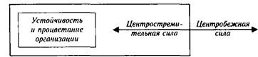Руководитель может в основе своей деятельности руководствоваться либо здравым смыслом («хотел сделать как лучше»), либо законами организации и для организаций. Здравый смысл обычно приводит к центробежным движениям в организациях от устойчивых состояний, а при научном подходе — к центростремительным движениям в сторону устойчивости и процветания (рис. 5). Примерами действия центробежных сил могут быть ситуация, предшествовавшая развалу СССР, развод в семье и т.д.