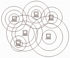 В этих случаях сеть реализуется при помощи сетевых радио-адаптеров, снабжённых всенаправленными антеннами и использующих в качестве среды передачи информации радиоволны. Такая сеть реализуется топологией "Все-Со-Всеми" и работоспособна при дальности 50-200 м.