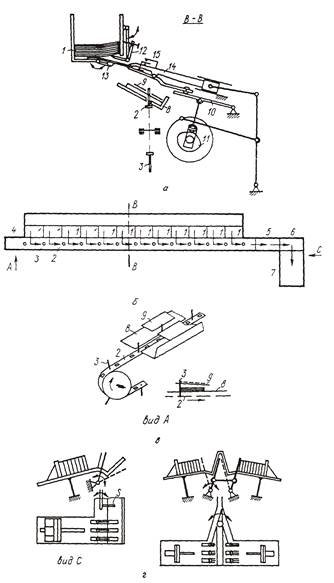Тетради укладываются вертикальными стопами в магазины 1 (рис. 40 а) в соответствии с их последовательностью в подбиваемом блоке. Присос 13 отгибает нижнюю тетрадь вниз, а качающийся крючок 12 приподнимает стопу вверх. Щипцы 14 захватывают тетрадь за корешок. Электрическое контактное устройство 15 подает сигнал и останавливает машину, если в щипцах 14 не окажется тетради или в них попадут две или более тетрадей. Управляемая кулаком 11 направляющая 10 открывает и закрывает щипцы 14. Тетрадь переносится щипцами 14 на пластину 9, а затем снимается поводками 3 сборочного транспортера 2 и движется ими по желобу 8 мимо других магазинов. Пластины 9 обеспечивают правильную укладку тетрадей в стопе, а наклонный желоб 8 способствует сталкиванию тетрадей по корешкам в процессе транспортировки.