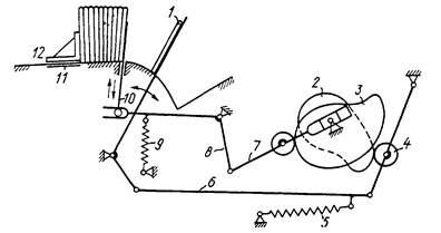 Кинематическая схема приемного устройства представлена на рис. 41. На приемный стол 12 подобранные комплекты тетрадей выводятся гребенкой 1, совершающей качательные движения снизу вверх и обратно с небольшими выстоями в крайних положениях. Блоки поступают на гребенку 1 от сборочного транспортера при помощи каретки, движущейся возвратно-поступательно. Кулак 2, находящийся на главном валу машины, сообщает колебательное движение гребенке 1 через ролик 4 и тягу 6. Пружина 5 возвращает механизм в исходное положение. Чтобы при опускании гребенки 1 комплекты тетрадей не падали назад, они удерживаются пальцами 10. При подъеме гребенки 1 с тетрадями к приемному столу 12 пальцы 10 выстаивают внизу и пропускают гребенку 1 с комплектом. Стопа тетрадей вместе с угольником 11 под нажимом гребенки 1 перемещается по столу 12. Затем пальцы 10 поднимаются, а гребенка 1 возвращается в исходное нижнее положение. Подъем пальцев 10 осуществляется кулаком 3 через рычаги 7 и 8. С помощью пружины 9 производится опускание механизма.