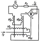 Коэффициент усиления МУ по току зависит крутизны характеристики управления. Наиболее простым способом увеличения коэффициента усиления МУ является увеличение числа витков обмотки управления. При увеличении числа витков управления возрастает ее индуктивность (Lу=kμдWу2), что обуславливает увеличение постоянной времени или инерционности МУ. В случаях, когда МУ предназначается для усиления быстро меняющихся сигналов, увеличение его инерционности недопустимо. Приходится обеспечивать увеличение коэффициента усиления МУ за счет изменения крутизны характеристики управления: введением в схему усилителя положительной обратной связи (ОС), при которой величина тока Iр зависит от алгебраической суммы средних значений магнитодвижущих сил управляющей и обмотки ОС.