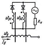 Конструктивно дроссельные МУ выполняются на двух одинаковых магнитопроводах стержневого типа. На каждом магнитопроводе размещаются полуобмотки Wу1 и Wу2. Полуобмотки рабочей обмотки включаются согласно, а обмотки управления встречно. За счет индуктивной связи между рабочими и полуобмотками управления в последних индуктируются ЭДС, которые равны по величине, но сдвинуты по фазе на 1800. Их сумма равна нулю еу1-еу2 =0, а поэтому цепь обмотки управления не потребляет энергии из цепи рабочей обмотки.