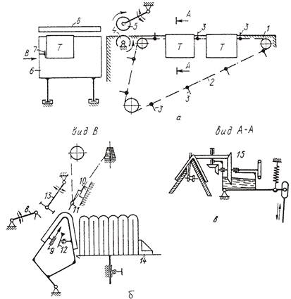 Очередная тетрадь Т (рис. 42 а) отделяется от подобранного комплекта или вручную в полуавтоматических машинах, или самонакладом в автоматах, раскрывается посередине и подается на седлообразный неподвижный стол 1, внутри которого движется цепной транспортер 2. Он в соответствии со скоростью и цикличностью работы машины поводками подает тетради к вталкивающим роликам 4 и 5, непрерывно вращающимся со скоростью, которая изменяется в соответствии с форматом и массой сшиваемых тетрадей. Верхний ролик 5 периодически перемещается вверх и вниз.