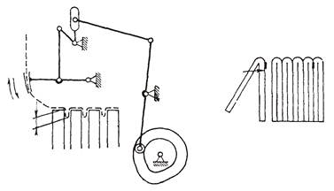 В машинах старых конструкций клей на корешковые поля приклеиваемых тетрадей наносился качающейся планкой 13 после пришивания проталкивающей тетради на приемный стол 14. Планка 13 поворачивалась периодически включаемым механизмом на 180°, снимала слой клея с валика клеевого аппарата, расположенного в зоне качания стола, наносила клей на тетрадь с одновременным проталкиванием ее на приемный стол 14 и, возвратившись в исходное положение, снова поворачивалась на 180°.