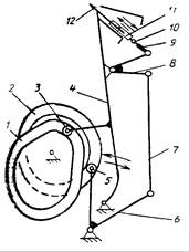 При качании рычага 6 проколам 12 сообщается движение через тягу 7, двуплечий рычаг 8, серьгу 9 и планку 11. Пружина через систему звеньев прижимает ролик 5 к нижней части кулака 2. Для регулировки уровня выхода проколов 12 поворачивают эксцентричный валик 10, соединяющий рычаг 8 с серьгами 9.