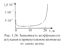 На рис. 1.24 представлена зависимость коэффициента затухания aдля медного волновода (23x10 мм) от длины волны. Из графика следует, что a достигает минимума при некоторой оптимальной длине волны и резко возрастает с увеличением l по мере приближения ее к критическому значению lкр При уменьшении l по сравнению с оптимальным значением потери увеличиваются. Это связано с увеличением значения поверхностного сопротивления RS с ростом частоты.
