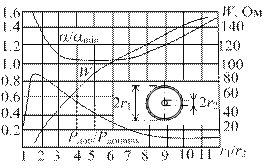 Рис 1.26. Зависимость затухания, допустимой передаваемой мощности и волнового сопротивления коаксиала от отношения r 1 / r 2
