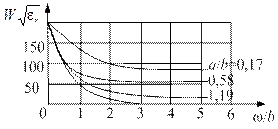 . Волновое сопротивление полосковой линии сложным образом зависит от ее геометрических размеров, и эта зависимость в элементарных функциях не выражается. На рис. 1.28представлена зависимость волнового сопротивления симметричной идеально проводящей полосковой линии от отношения w / b при t = 0. Параметром графиков является нормированная ширина пластины а / b.