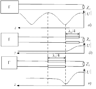 Таким образом, четвертьволновый трансформатор для согласования может включаться в таких сечениях линии z 0, в которых входное сопротивление линии чисто активное. Входное сопротивление линии чисто активное в сечениях линии, где напряжение достигает максимума или минимума. Поэтому четвертьволновый трансформатор включается в максимумах или минимумах напряжения и его волновое сопротивление определяется соотношением: