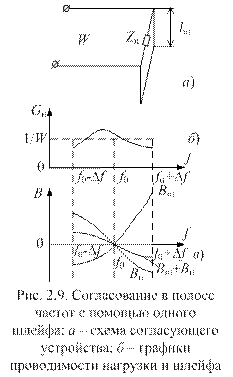 Таким образом, подбором величины волнового сопротивления шлейфа и его длины можно изменять наклон кривой В ши полосу частот, в которой реактивная проводимость изменяется в допустимых пределах.