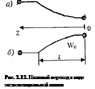 Плавный переход, по существу, является нерегулярной двухпроводной линией передачи, в которой погонные параметры и волновое сопротивление – функции продольной координаты. При этом эквивалентная схема элементарного участка такой линии длиной dz имеет вид, как и для регулярной линии (см. рис. 1.10). Поэтому остаются справедливыми телеграфные уравнения (1.2). Все входящие в эти уравнения величины зависят от z. В частности, для двухпроводной экспоненциальной линии (рис. 2.12) при увеличении z растет | Z 1|, а | Y 1| уменьшается.