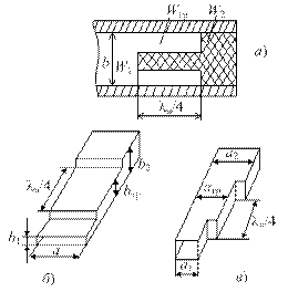 . Рис.2.13. Четвертьволновые трансформаторы в волноводном исполнении для согласования волноводов с различным диэлектрическим заполнением (а) и с различными размерами узких (б) и широких (в) стенок