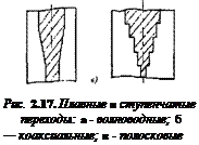Четвертьволновые трансформаторы и шлейфы являются узкополосными согласующими устройствами. К широкополосным согласующим устройствам относятся ступенчатые и плавные переходы. На рис. 2.17. показаны варианты исполнения таких устройств на основе прямоугольных волноводов, коаксиалов и полосковых линий.
