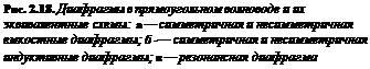 Диафрагмой называется тонкая металлическая перегородка, частично закрывающая поперечное сечение волновода. Различают диафрагмы емкостные, индуктивные и резонансные. Их вид и эквивалентные схемы представлены на рис 2.18. Нормированные значения проводимости емкостной и индуктивной диафрагм определяются приближенными соотношениями