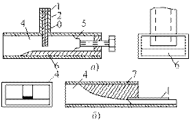 Рис. 3.9. Волноводно-полосковые переходы: а – зондовый на симметричную полосковую линию; б – П-образный на несимметричную полосковую линию; 1 – центральный проводник; 2 – металлическая пластина; 3 – диэлектрическая подложка; 4 – прямоугольный волновод; 5 – поршень; 6 –металлический клин; 7 – гребень П-образного волновода