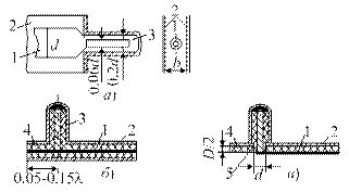 Рис 3.10.Коаксиально-полосковые переходы: а – непосредственный на симметричную полосковую линию; б – перпендикулярный на симметричную полосковую линию; в – перпендикулярный на несимметричную полосковую линию; 1 – центральный проводник; 2 – металлическая пластина; 3 – коаксиальная линия; 4 –разомкнутый шлейф; 5 – отверстие для согласования перехода