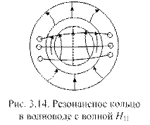 Резонансные металлические кольца могут быть использованы для подавления волны H 11 вместо гасящих объемов. Так как кольца тонкие, то они не оказывают заметного влияния на распространение волны E 01. Силовые линии магнитного поля этой волны параллельны кольцу и не вызывают появления в кольце кольцевого поверхностного тока. Однако структура магнитных силовых линий волны H 11 такова, что в кольце возбуждается поверхностный кольцевой ток (рис. 3.14). Амплитуда этого тока максимальна при резонансной длине кольца 2p r к=l. В данном случае такое кольцо интенсивно отражает волну H 11. Для усиления эффекта гашения этой волны используют два резонансных кольца, размещаемых на расстоянии L друг от друга: L = 2(n + 1) l H 11/4, где n = 1,2.