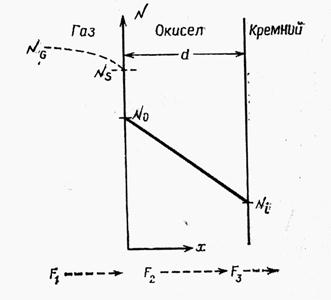 В этом случае окислитель только диффундирует сквозь пленку, не накапливаясь в ней. Иными словами поток атомов окислителя j постоянен по всей ее толще, а градиент концентрации постоянен по толще пленки.