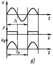 В зависимости от числа фаз напряжения и вида функции F(t) могут быть получены различные варианты выпрямления. На рисунке показаны диаграммы работы однофазных выпрямителей (рис. б-г). Для схемы рис. б (с идеальным диодом) в нагрузку передается один полупериод напряжения u1(t). Поэтому такой выпрямитель называют однополупериодным.