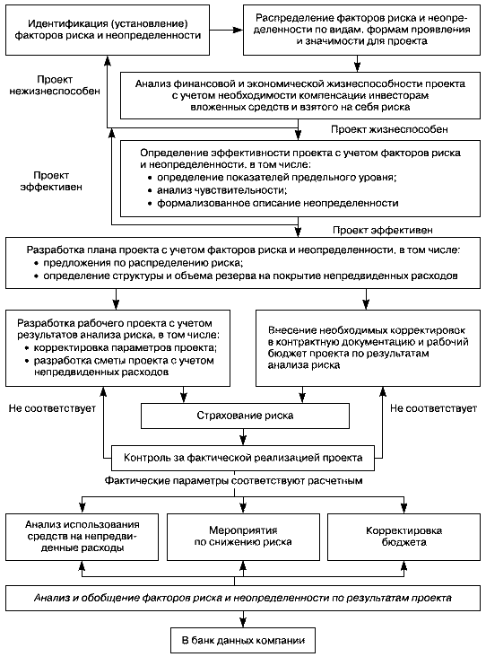 В ситуации, когда универсальным законом экономики является неопределенность конечного результата вложений, субъект экономики, избегающий риска, вынужден искать способы, позволяющие ему не потерять свои вложения. В связи с чем анализ и учет неопределенности и рисков при инвестировании в инновационные проекты предполагает углубленное изучение как можно большего числа неконтролируемых факторов, способных повлиять на осуществление проекта и выбор наиболее действенных и оптимальных по затратам методов и технологий оценки, анализа, учета, управления, снижения и оптимизации рисков. Модель организации работ по управлению риском приведена на рис. 7.2.