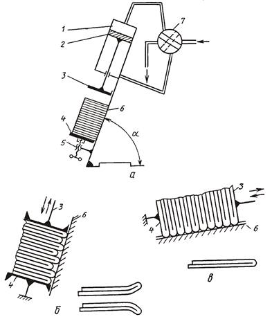 Паковально-обжимные прессы, обычно имеющие пневматический или гидравлический привод, делятся по расположению оси движения прессующей плиты на вертикальные и горизонтальные. На рис. 47 схематически показано принципиальное устройство паковально-обжимного пресса. В его состав входят пневматический цилиндр 1, поршень 2, верхняя прессующая плита 3, неподвижная плита 4, регулировочное устройство 5, станина 6, кран управления 7. Угол наклона к горизонтали a для вертикальных прессов 75−80°, а для горизонтальных прессов − 15−20°.