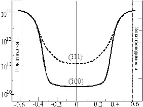 Величину всех этих зарядов обычно относят к единице площади границы раздела, т.е. измеряют в единицах Кл∙см-2. Вместо зарядов часто используют соответствующие поверхностные плотности, которые обозначают символом Ni с теми же индексами (Ni =Qi/ q – число зарядов на 1 см2). Поскольку энергетические уровни состояний, захватывающих поверхностный заряд Qss, непрерывно распределены в запрещенной зоне полупроводника, полезной характеристикой является энергетическая плотность поверхностных состояний